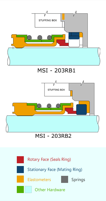 Seal Type : MSI-203RBThe Type MSI-203RB is single coil spring rubber bellow seal used for water and oil containing slurries. Shaft run out is compensated by rubber bellow and spring due to its self aligning capability.