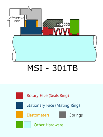 Seal Type : MSI-301TBThe Type MSI-301TB is Externally mounted low pressure mechanical seal with metal free contact parts due to corrosive pumping media.Series MSI-301TB is designed for highly corrosive chemicals such as concentrared acids, chemically active organic compound, Corrosive and Abbrasive liquid.